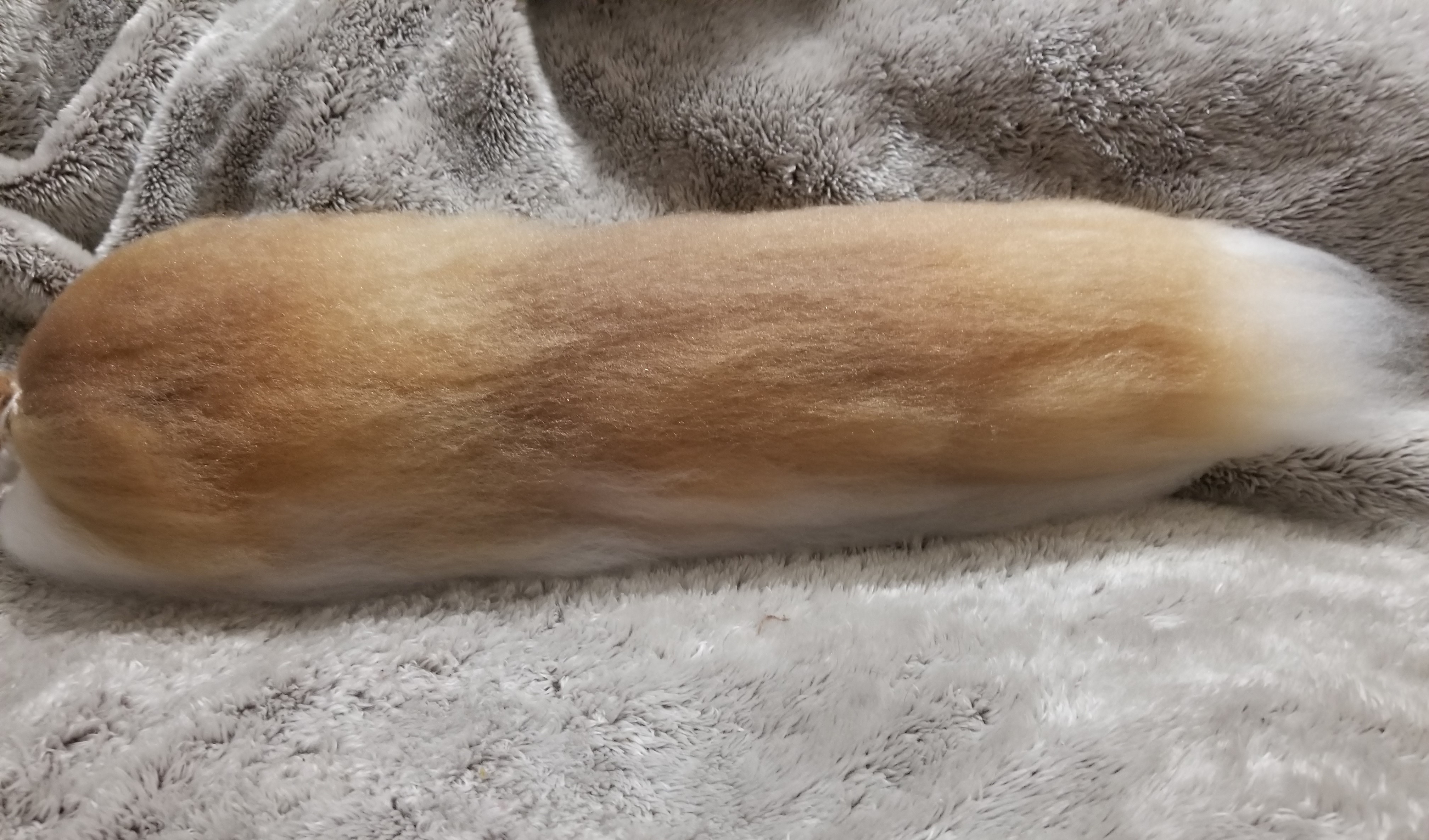 22" Blonde Husky tail made with multiple shades of browns and a white under side. Made to mimic the traditional Husky tail, but is not wired so it can not be curled. It was a mix of soft and rough fur to give it a more natural feel instead of being overly soft.