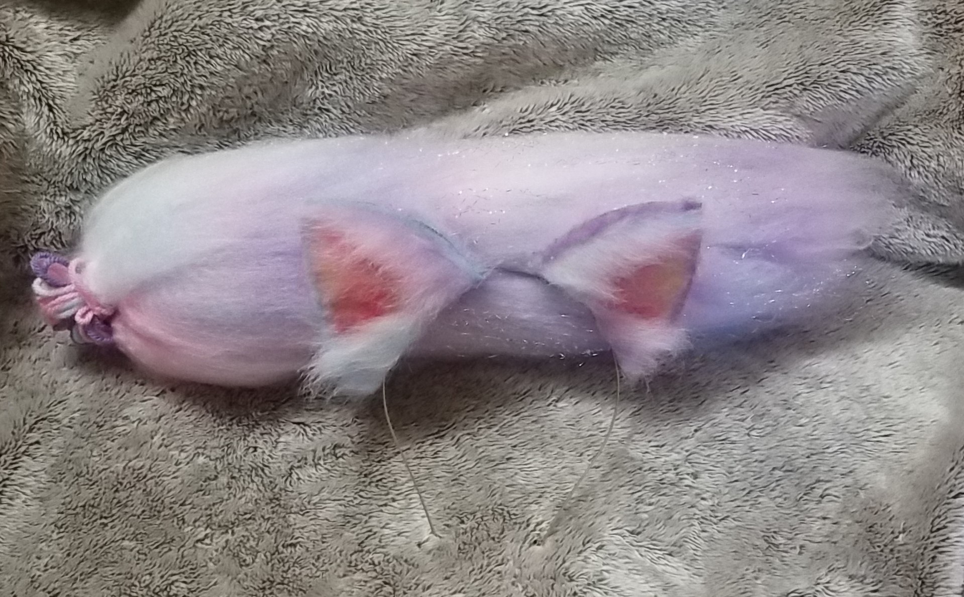 18" Milky Way Kitten tail with mismatched kitten ears airbrushed to match the coloring. can come with out the tinsel that is in the tail. (In the photo the ears look off on the headband, they are not yet attached and that is why.)