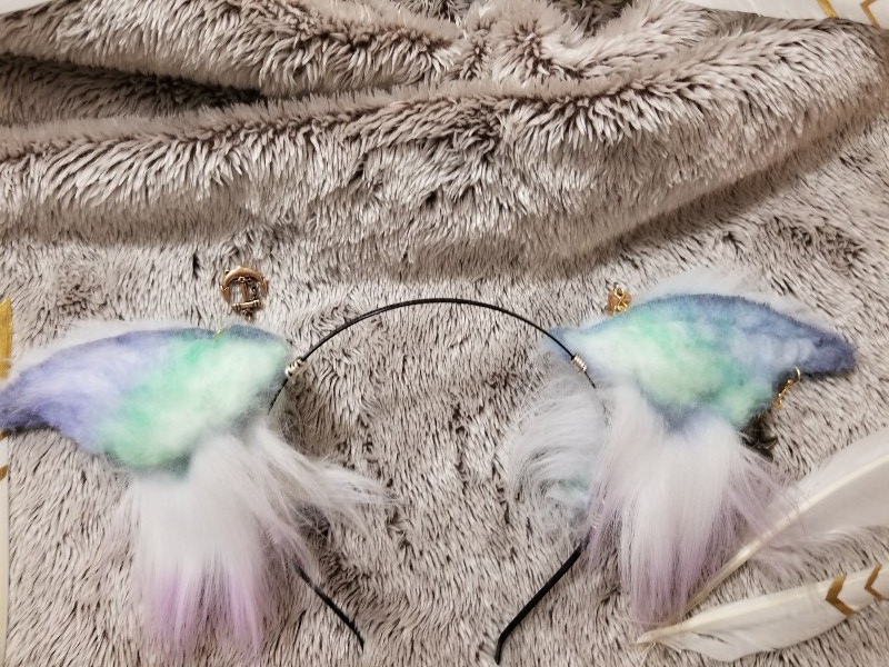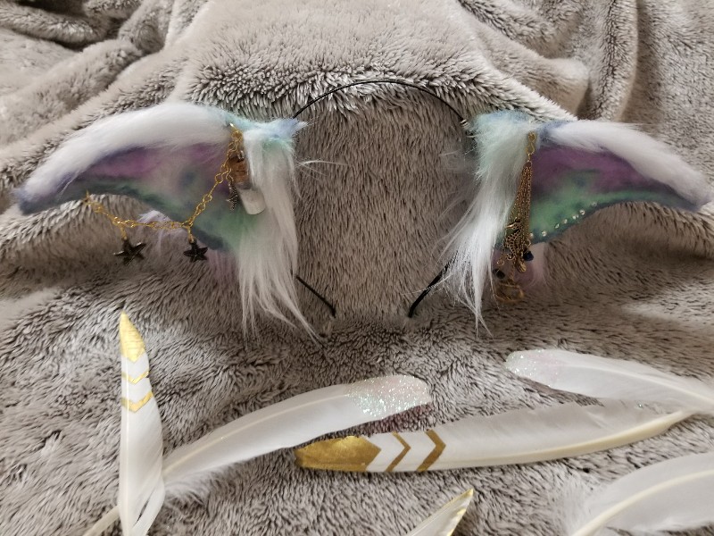Medium sized ears themed after the Kelpie that comes from Celtic Folklore. Hand painted using water based airbrush paint, trimmed by hand so there is some uneveness. The is a foam base inside of the ears with wire running along the inner ridge as well as the bottom of the ears. Wire is the form of attachment to the head band, can be moved up and down as well as removed and added to a different band if you choose. One ear has a dangling earing with multiple charms and a line of geams. Other ear has a looped chain with three star fish and a jar of dirt that has a small shell inside of it. All chains were hand assembled.